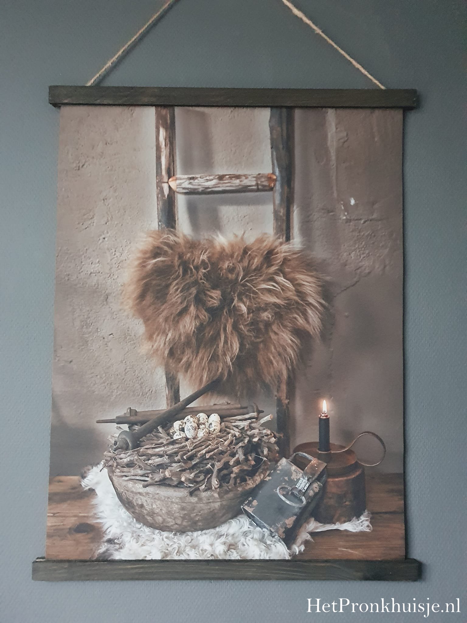 De doeken worden afgewerkt met houten latten en een robuust touw om hem op te hangen.