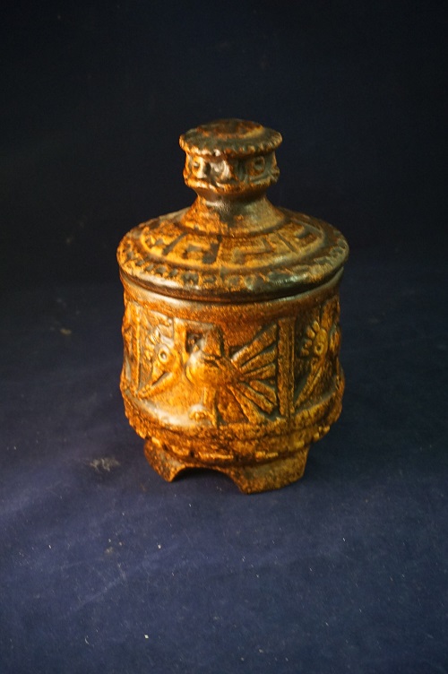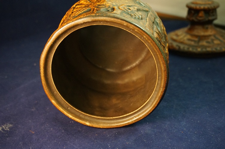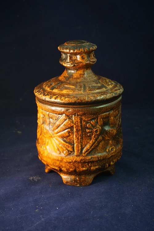 Zeer zeldzame Jasba 2200 20 pot met deksel. Vintage uit de jaren 70. Een mooi potje op ronde voet met deksel gemaakt in West Duitsland. Geweldige vorm en voorzien van interessant vogeldecor. Materiaal: keramiek. In zeer goede staat. Kleur: Bruin/Brons. Afmeting: ongeveer 21 cm hoog, opening rand ongeveer 13 cm.
